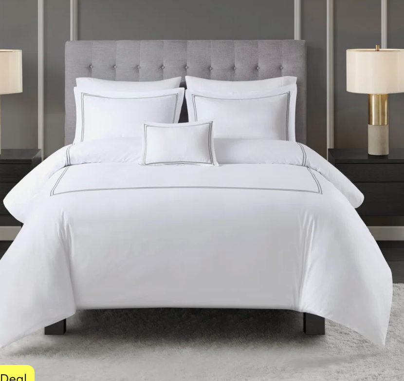 Bedframe Comforter Sheets Area Rug Throw Pillow Curtains Night Stands Wall Sconces Chaise Small Drink Table